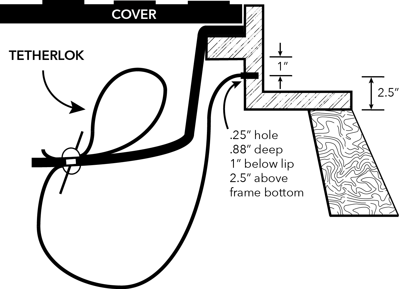 3/16″ braided stainless steel cable with drive pin anchors the insert permanently to the manhole frame. The cover cannot be closed until the insert is properly reattached, forcing accountability during maintenance. Prevents costly retrievals and downstream blockages.